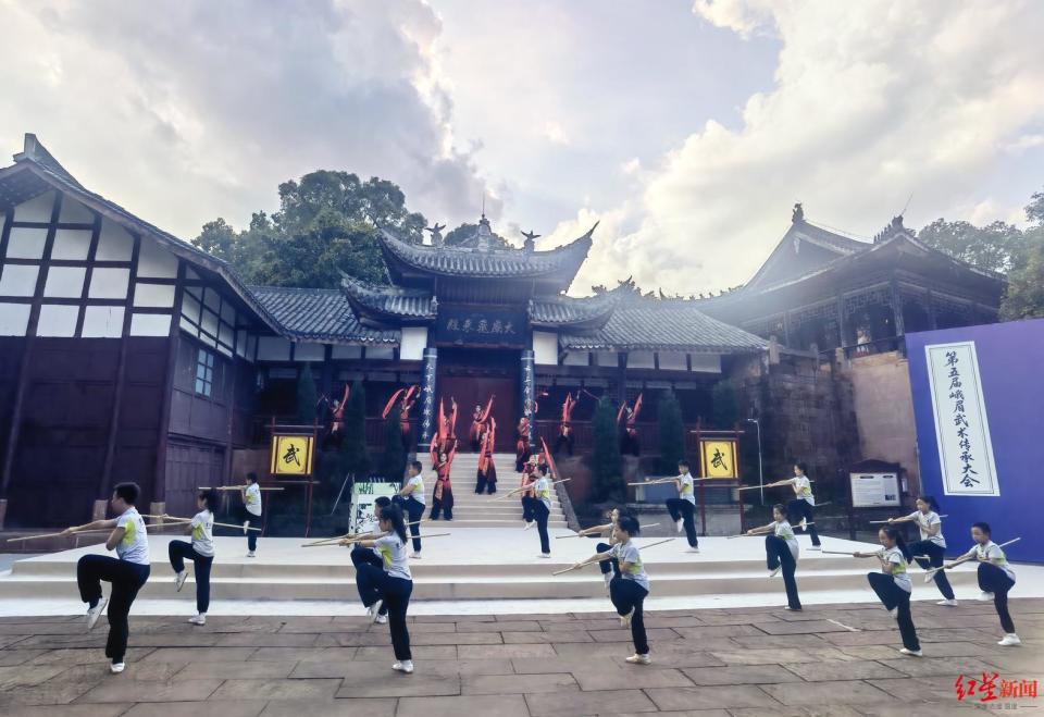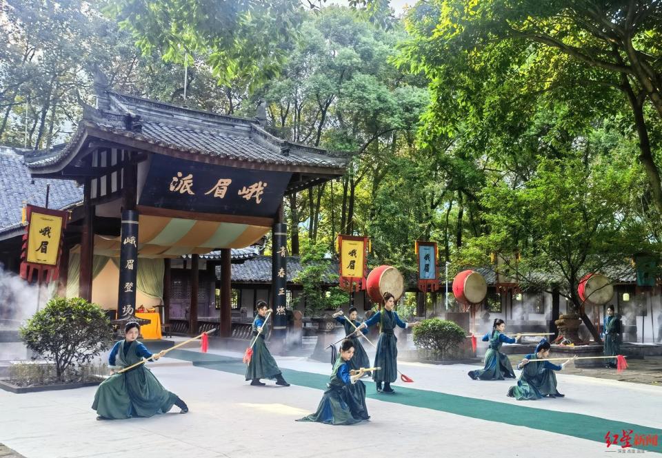 当天下午17时,本届大会在《英雄汇峨眉》的精彩表演中拉开帷幕。从山门、九蟒殿到飞来殿,峨眉武术展演次第铺展,峨眉刺的灵动、峨眉拳的沉稳,与古建飞檐相映,形成“一步一武、一景一韵” 的沉浸式体验。