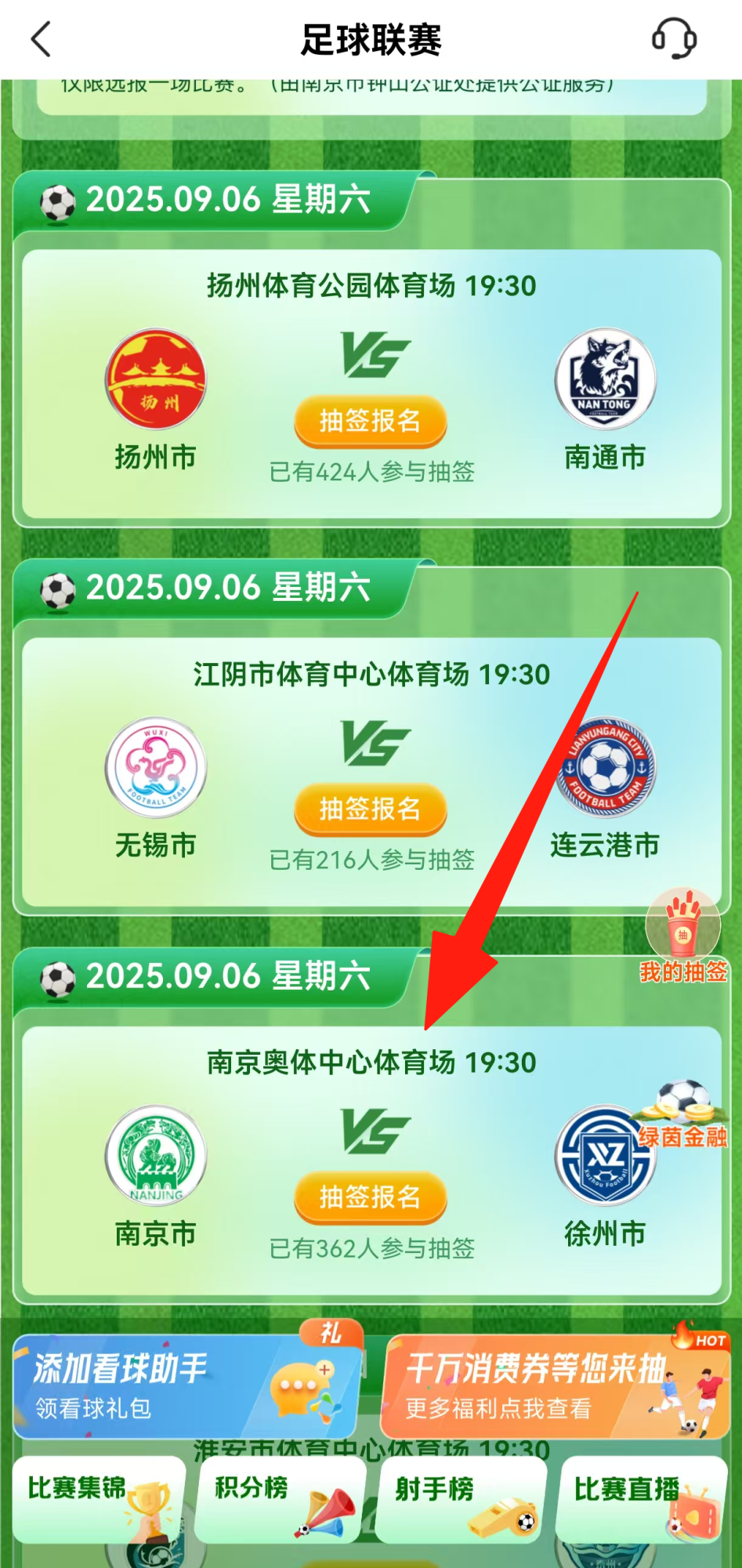 参与路径:登录江苏银行App,进入“联赛专区”选择意向观赛的场次,点击“抽签报名”即可完成登记。